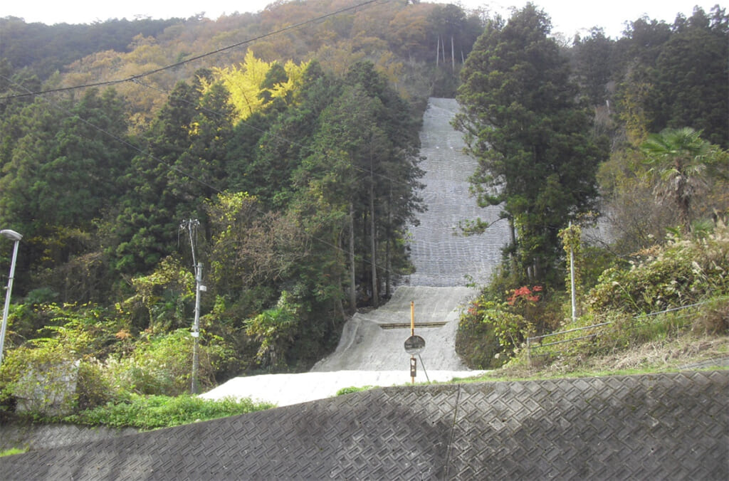 まず、写真①が現場の全体像です。愛媛県砥部町のひろた・神の森という場所で、2018年7月に起こった西日本豪雨にて被災し、土砂崩れが起きました。そこで、2021年7月から斜面整地を始め、施工が行われていきました。