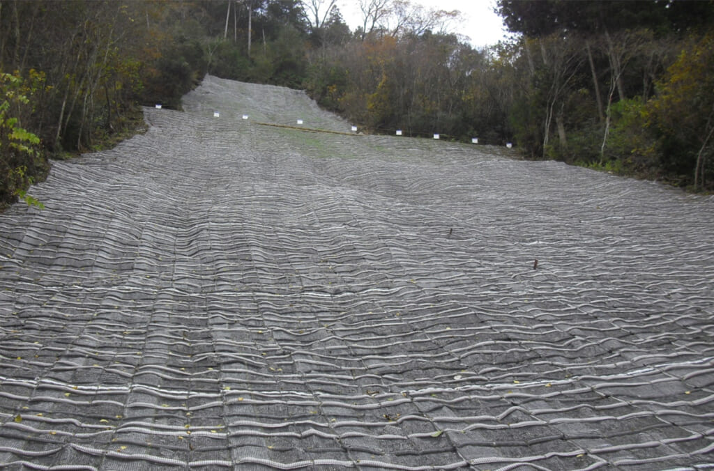 使用した商品は日本植生㈱様のキョウジンガーと、ハリシバモックです。写真①で奥側の急な斜面で使われているのがキョウジンガー、手前の比較的緩やかな場所で貼られているのがハリシバモックです。使い分けとしては、法面整地が行われた軟岩等がある斜面で使用するのが前者で、盛土がされている場所で使用されるのが後者となります。
