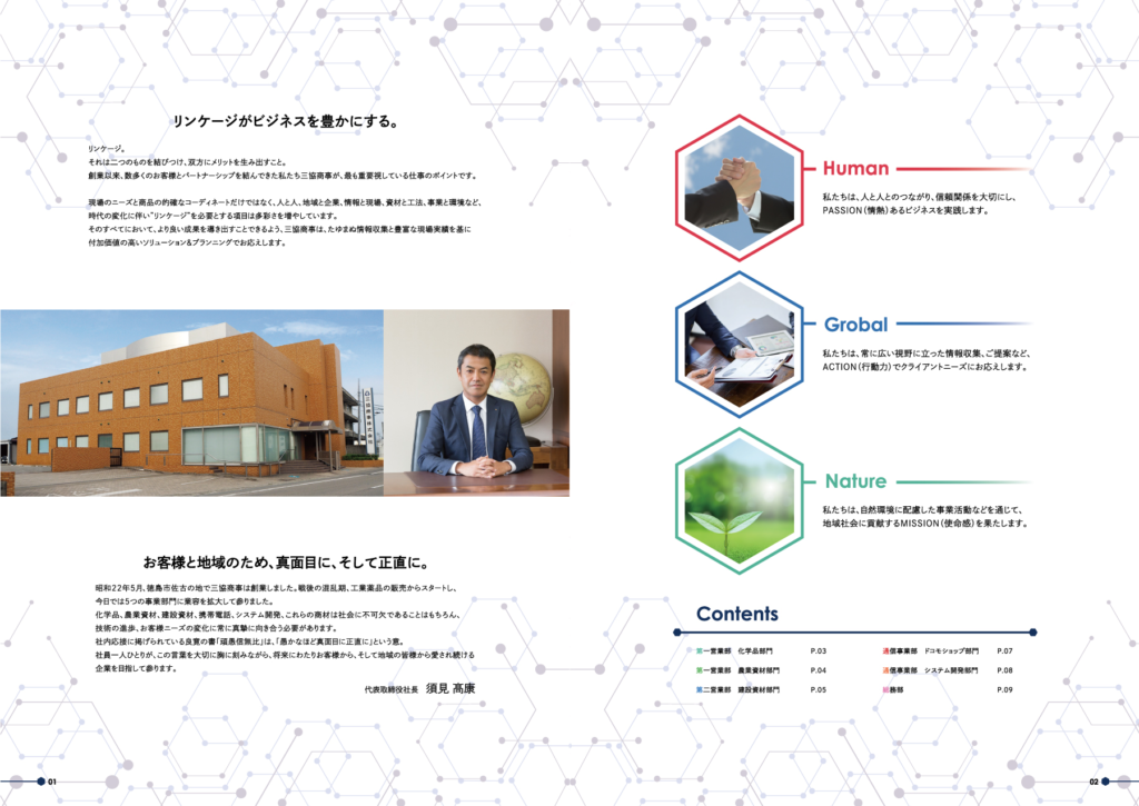 前回制作時より数年ぶりに新しくなり、各部署の新しい社員の写真や、取扱商品の増加、新事務所の開設など、新たな情報が追加されています。