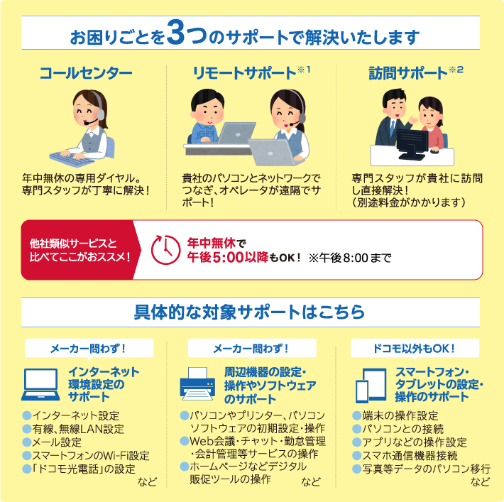 また、パソコンやスマートフォンの画面を共有しながらのリモートサポートや、訪問サポート(別途料金)も対応可能です。