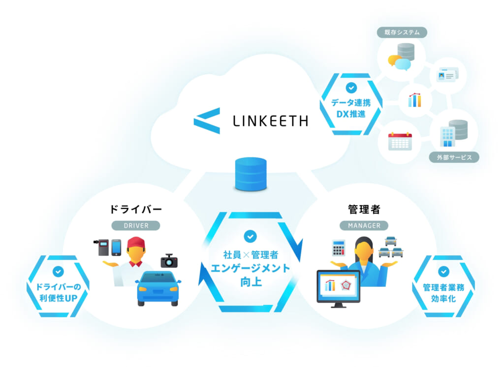 『LINKEETH』は、道路交通法改正に対応したクラウド型アルコールチェックサービスです。クラウド型の強みを活かして、いつでもどこでもリアルタイムな測定が可能となるため、ドライバーの負担を軽減することができます。また、管理画面を通して測定結果をシステム上からすぐに把握することができる他、務付けられている8項目を一元管理できるため、管理者も安心して運用が行えます。