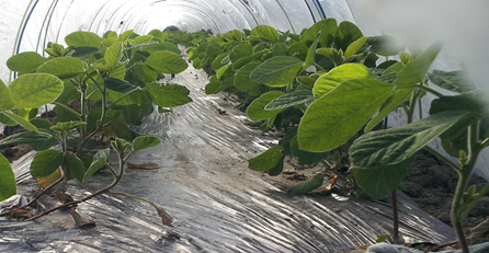 寒いときにはこの上にビニールで覆います。土も暖かく、空気も暖かい。まさに夏の気候です。左上の写真は種を播いて35日後です。大きく成長しています。