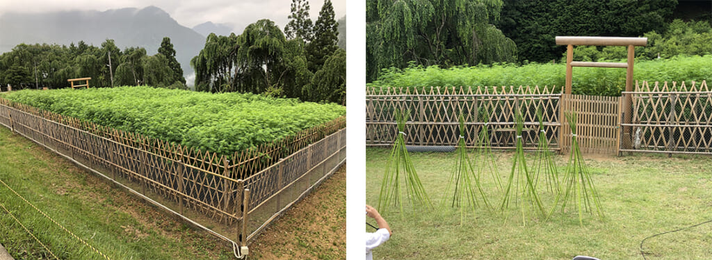 大麻は成長が早く3か月で2.5m程の高さまで伸びておりました。収穫された大麻は繊維にされ忌部神社で麻織物に織り上げられ調進されたようです。